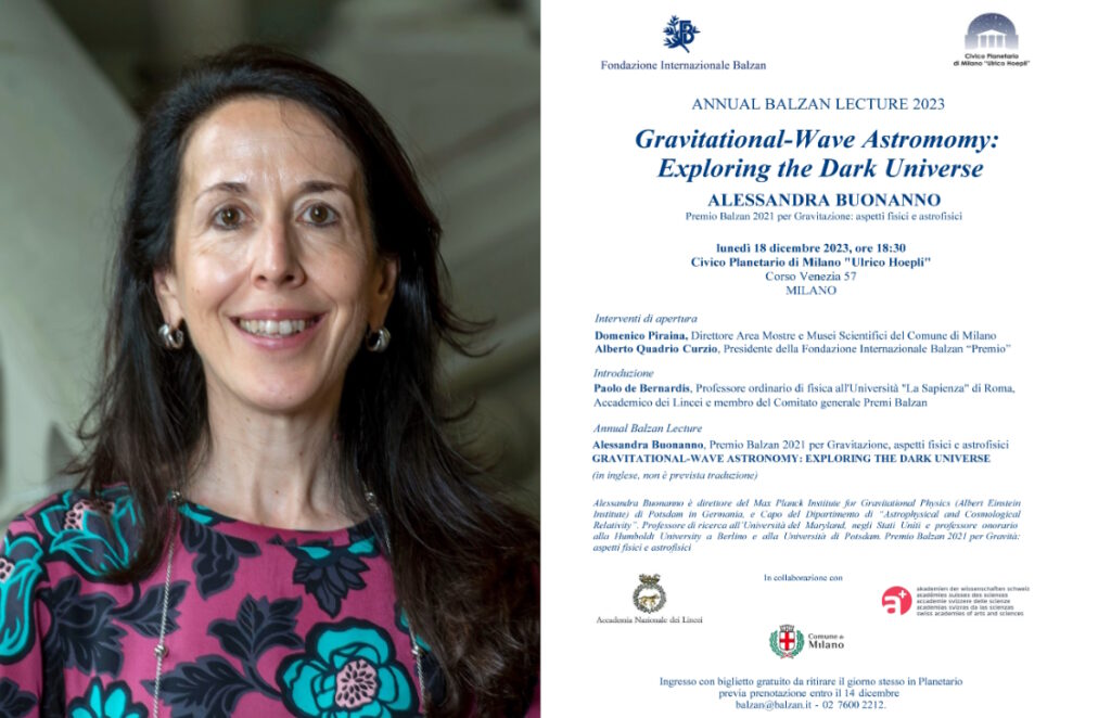 Alessandra Buonanno, Premio Balzan 2021 per Gravità: aspetti fisici e astrofisici, terrà al Civico Planetario di Milano “Ulrico Hoepli”, lunedì 18 dicembre, alle ore 18:30, la Annual Balzan Lecture 2023 dal titolo Gravitational-Wave Astronomy: exploring the Dark Universe.